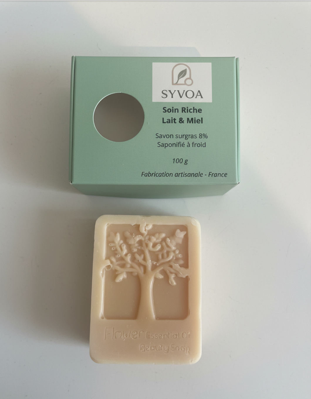 8% superfatted handmade soap with goat's milk and honey for face and body, handmade in France using cold saponification. Moisturizes, soothes, and nourishes sensitive skin for soft, radiant skin.